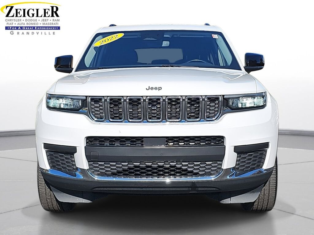Recent Arrival! Certified. 2022 Jeep Grand Cherokee L Laredo Bright White Clearcoat 115V Auxiliary Power Outlet, 2nd Row 60/40 Bench w/Manual Tip/Slide, 2nd Row Seat Center Armrest/Cupholders, 3 Rear Seat Head Restraints, 3.45 Rear Axle Ratio, 3rd Row Charge-Only USB Ports, 3rd row seats: split-bench, 4-Wheel Disc Brakes, 6 Speakers, 7-Passenger Seating, ABS brakes, Air Conditioning, Alloy wheels, AM/FM radio, Anti-whiplash front head restraints, Automatic temperature control, Brake assist, Bumpers: body-color, Center Rear 3-Point Seat Belt, Cloth Seats, Compass, Delay-off headlights, Driver door bin, Driver vanity mirror, Dual front impact airbags, Dual front side impact airbags, Electronic Stability Control, Emergency communication system, Four wheel independent suspension, Front anti-roll bar, Front Bucket Seats, Front Center Armrest w/Storage, Front dual zone A/C, Front reading lights, Fully automatic headlights, Heated door mirrors, Heated Front Seats, Heated Steering Wheel, Illuminated entry, Knee airbag, Leather Wrapped Steering Wheel, Low tire pressure warning, Luxury Tech Group I, Manual Fold Seatbacks, MOPAR Black Side Steps, Normal Duty Suspension, Occupant sensing airbag, Outside temperature display, Overhead airbag, Overhead console, Panic alarm, ParkView Rear Back-Up Camera, Passenger door bin, Passenger vanity mirror, Power door mirrors, Power driver seat, Power Liftgate, Power steering, Power windows, Quick Order Package 22A, Radio data system, Radio: Uconnect 5 w/8.4" Display, Rain Sensitive Windshield Wipers, Rear air conditioning, Rear anti-roll bar, Rear reading lights, Rear window defroster, Rear window wiper, Reclining 3rd row seat, Remote keyless entry, Remote Start System, Security system, Selectable Tire Fill Alert, Speed control, Speed-Sensitive Wipers, Split folding rear seat, Spoiler, Steering wheel mounted audio controls, Tachometer, Telescoping steering wheel, Tilt steering wheel, Traction control, Trip computer, Variably intermittent wipers, Voltmeter, Wheels: 18" x 8.0" Fully Painted Aluminum, Wireless Charging Pad.