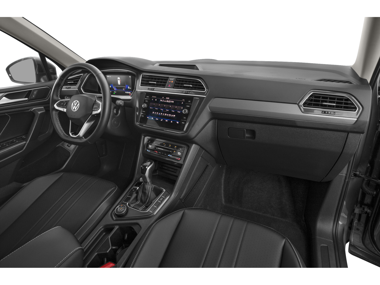 Stepping inside, you'll be greeted by a wealth of premium features that elevate the driving experience. The Tiguan's spacious and well-appointed interior offers the perfect balance of comfort and convenience. Sink into the heated front seats with perforated V-Tex leatherette upholstery and enjoy the convenience of dual-zone automatic climate control, a power driver's seat, and a panoramic sunroof that floods the cabin with natural light.