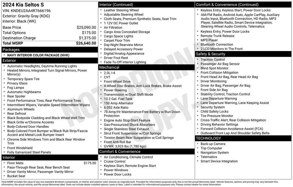 Powered by a 2.0L I4 MPI engine and delivering an impressive 28 city/34 highway MPG, the Seltos S provides the perfect balance of efficiency and performance. Enjoy the confidence of front-wheel drive and the convenience of a CVT transmission, all while benefiting from a host of advanced safety features, including: