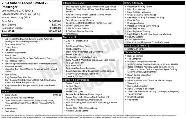 Elevate your driving experience with this stunning 2024 Subaru Ascent Limited. Boasting a powerful 2.4L 4-cylinder DOHC 16V engine and Lineartronic CVT transmission, this all-wheel-drive SUV delivers an exceptional blend of performance and efficiency, earning an impressive 19 city/25 highway MPG.